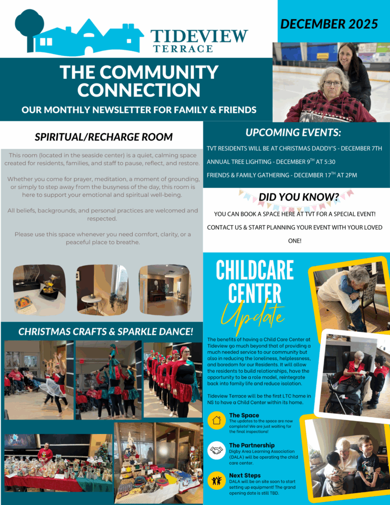 Tideview Terrace is located in Digby, in a pleasant and quiet residential area close to all essential services. Our door is always open. Our commitment is to keep our residents secure, happy and content in their new home.